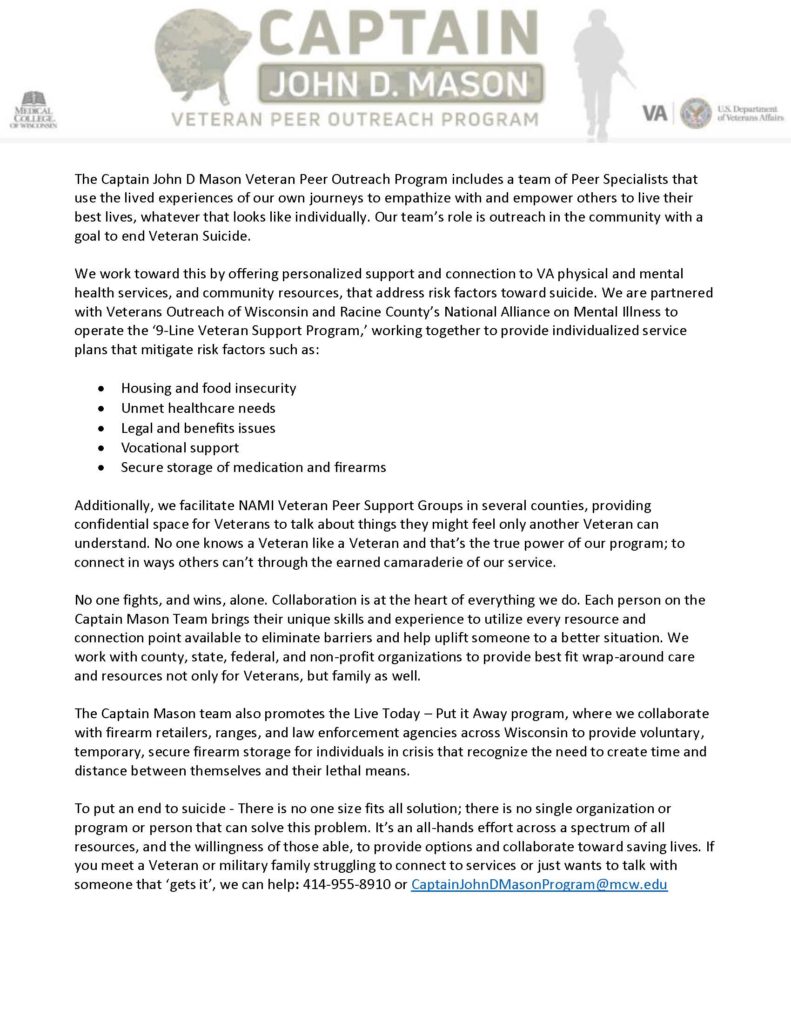 FREE – There are NO FEES for this program. The Captain Mason Program partners with the Southeastern Wisconsin Veteran Suicide Prevention Taskforce and the Department of Veterans Affairs.